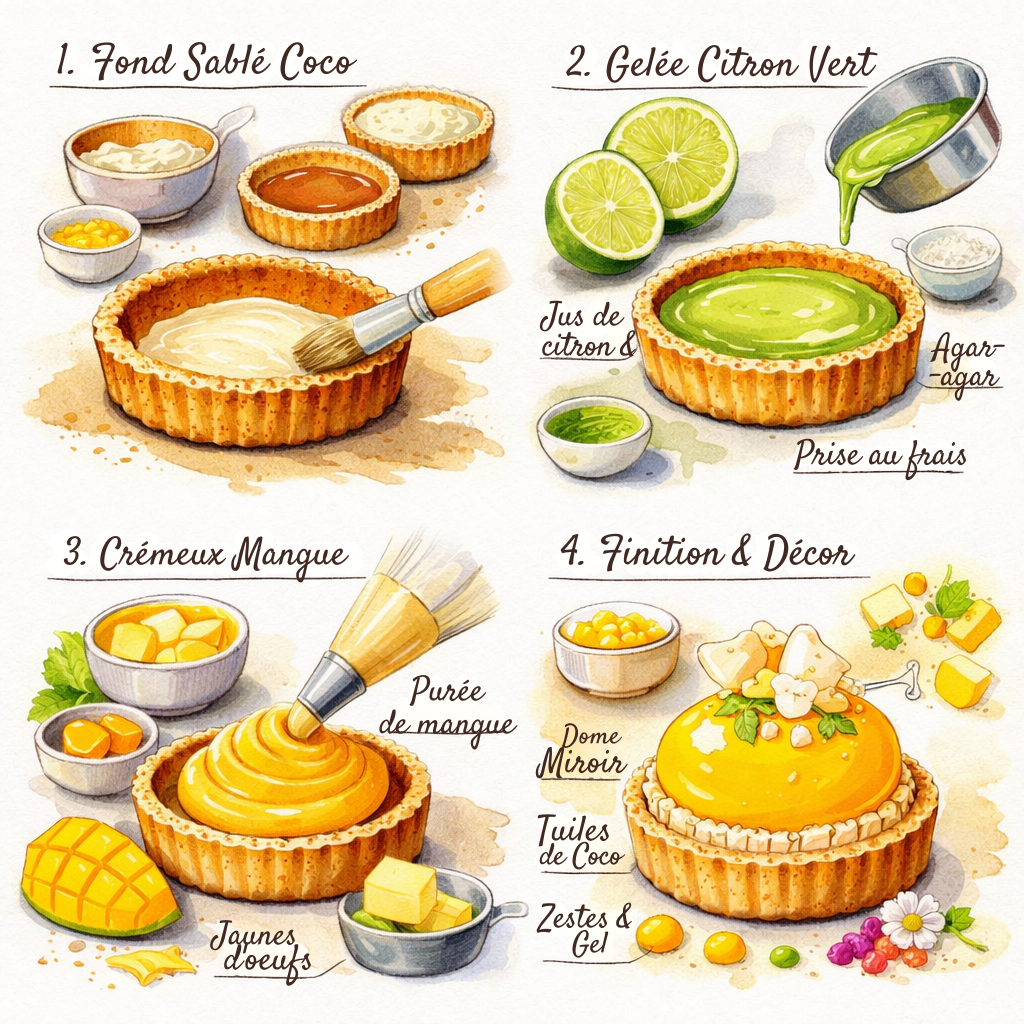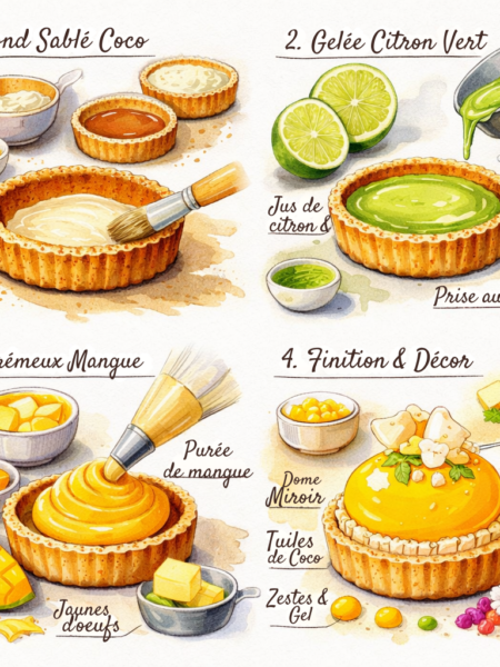 Le point clé de cette recette, c’est l’équilibre. La mangue apporte la rondeur et le côté gourmand, le citron vert donne la tension aromatique, et la coco reste en soutien pour apporter une note douce, presque solaire, sans saturer le dessert. On ne cherche pas un dessert très sucré : on cherche un dessert précis, lumineux, avec des textures contrastées et un goût net en bouche. Résultat : une tartelette qui plaît autant aux amateurs de classiques qu’aux clients qui veulent une assiette plus contemporaine.